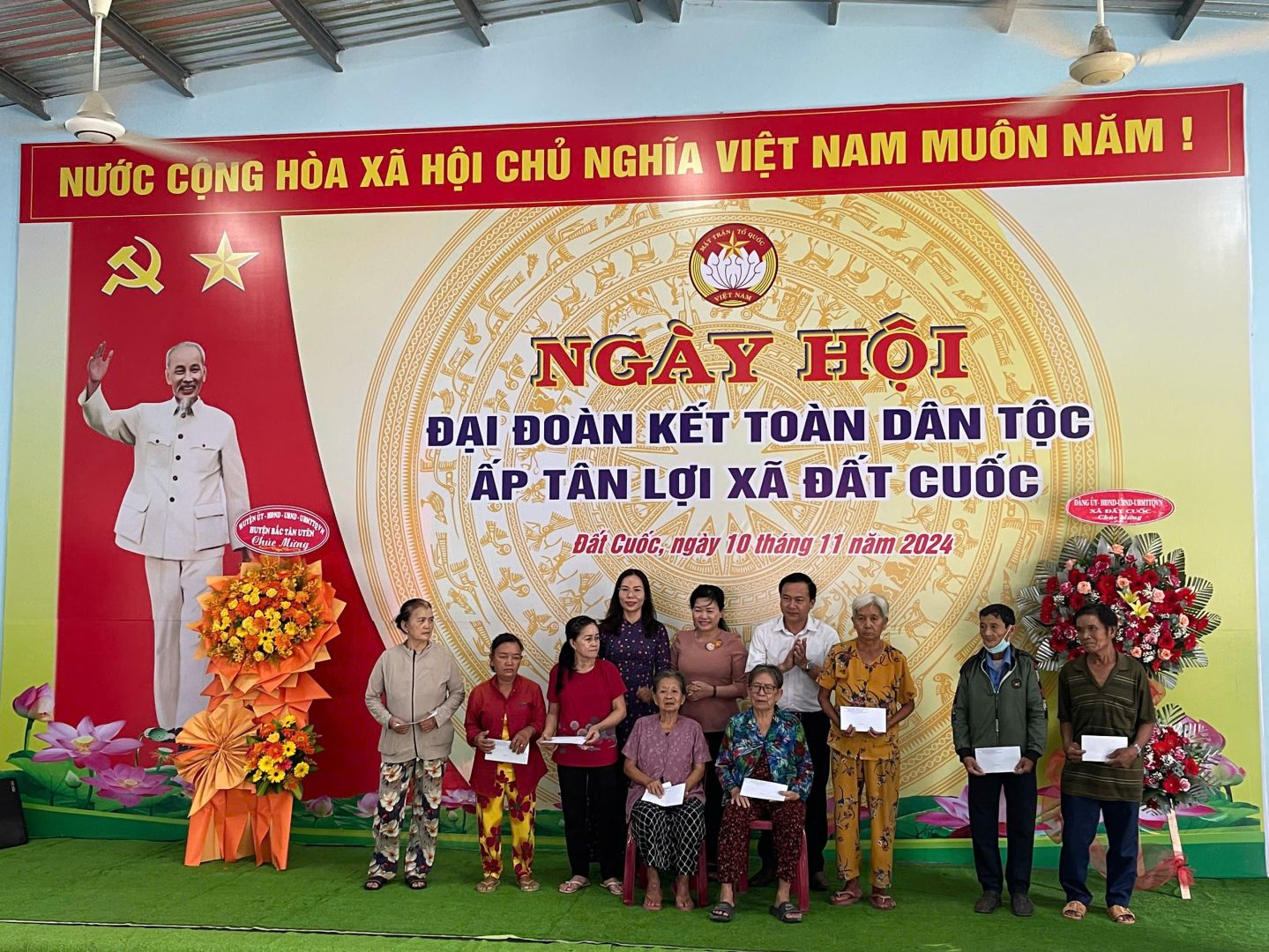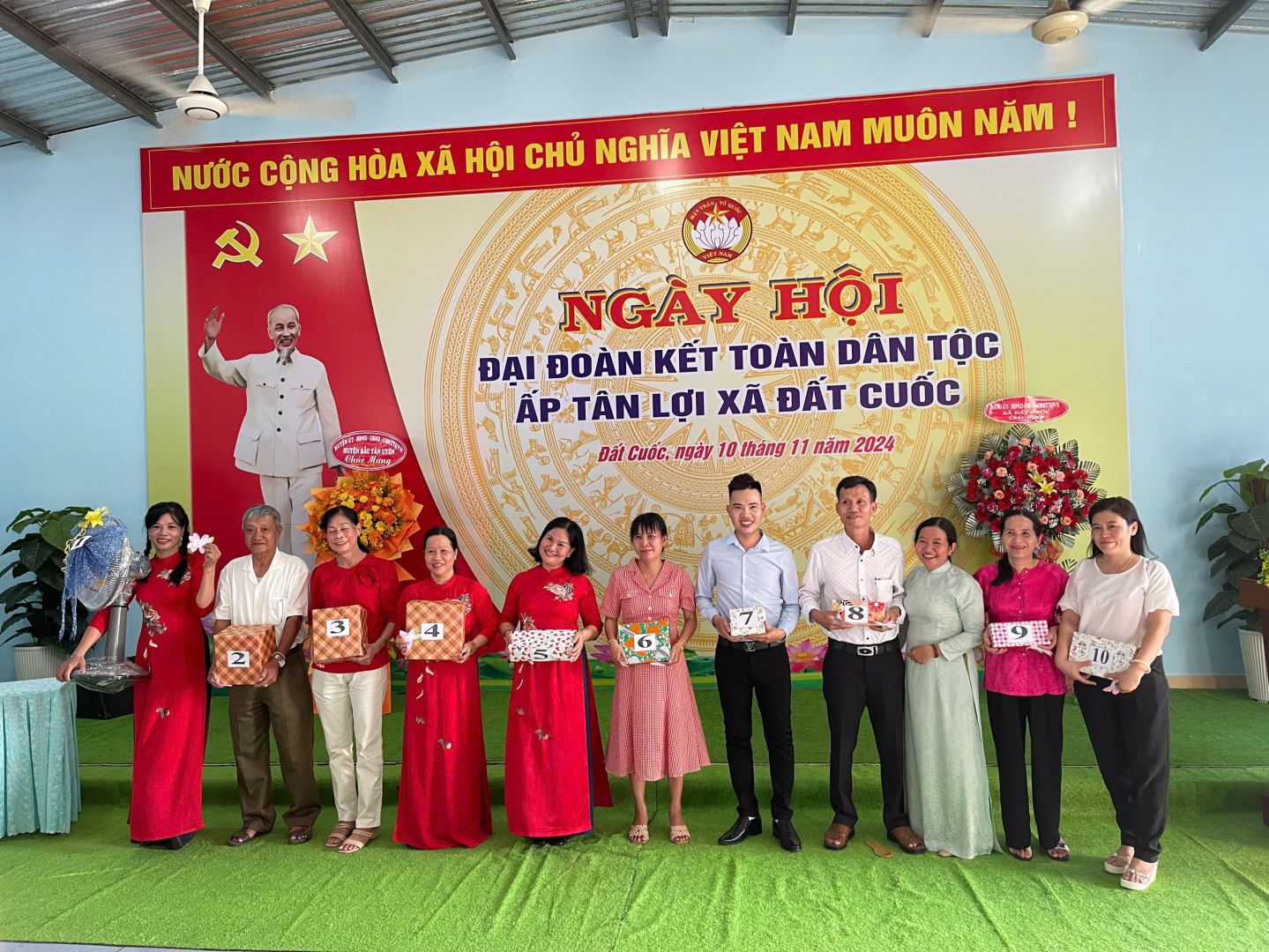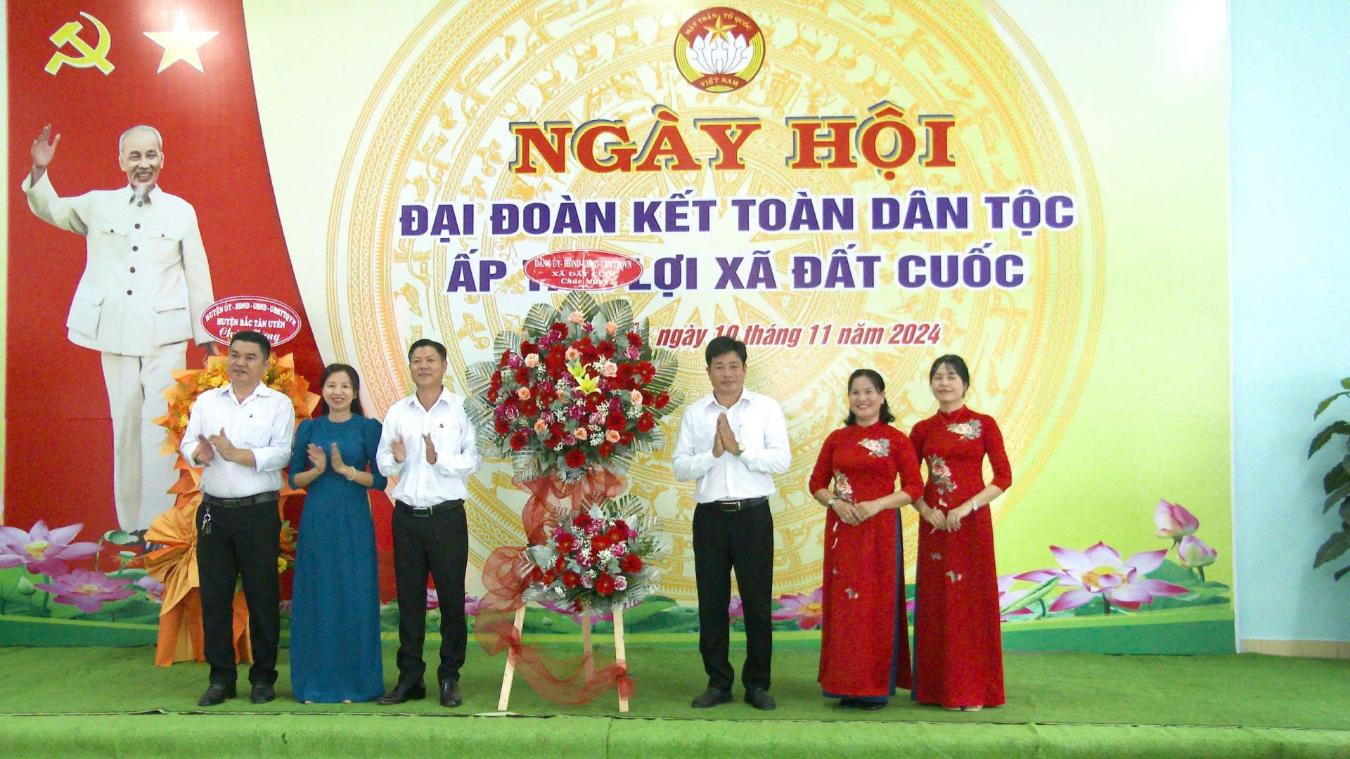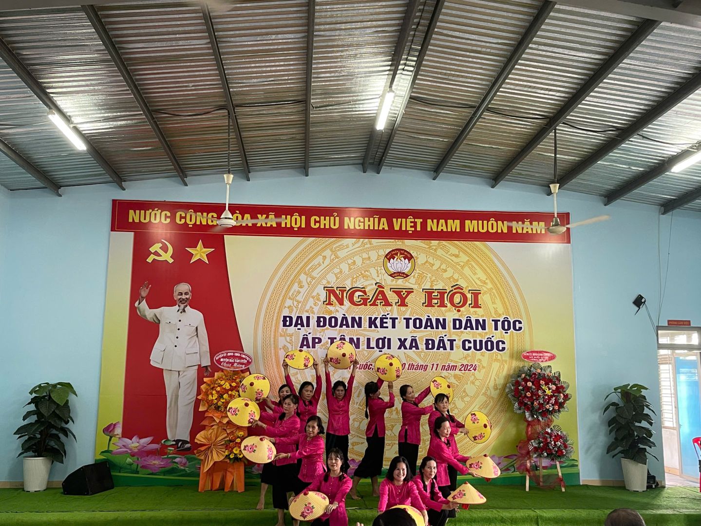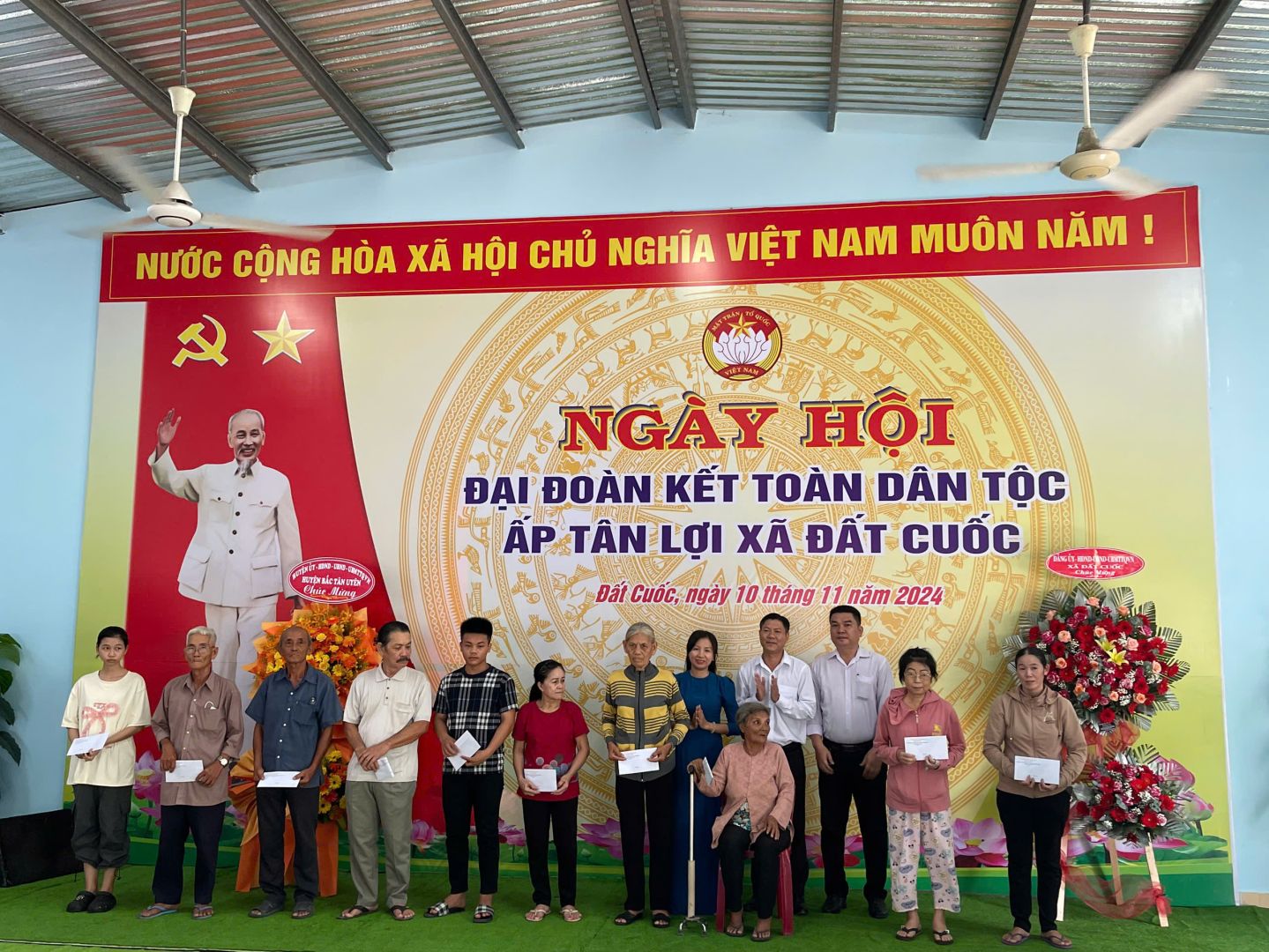 Chiều ngày 10/11/2024, Ban công tác Mặt trận ấp Tân Lợi, xã Đất Cuốc, huyện Bắc Tân Uyên phối hợp cùng Ban điều hành ấp tổ chức Ngày hội đại đoàn kết toàn dân tộc năm 2024. Được biết đây là 1 trong 3 ấp trên địa bàn huyện được chọn để làm điểm tổ chức Ngày hội đại đoàn kết của Tỉnh. Đến dự ngày hội có bà Trần Thị Kim Lan-Phó Chủ tịch Ủy ban MTTQ VN tỉnh, ông Bùi Hữu Toàn-Giám đốc sở Văn hóa, thể thao và Du lịch tỉnh, bà Nguyễn Thị Tuyết Thanh-Chánh án Tòa án nhân dân tỉnh, ông Thái Thanh Bình-Tỉnh ủy viên-Bí thư Huyện ủy, ông Nguyễn Thanh Lâm-Ủy viên Thường vụ-Trưởng Ban Tổ chức Huyện ủy, bà Lê Huỳnh Lê-Ủy viên Thường vụ-Chủ tịch UBMTTQVN huyện, bà Nguyễn Thị An Kim-Huyện ủy viên- Trưởng phòng VHTT huyện, lãnh đạo Đảng ủy, HĐND, UBND, UBMTTQVN, các ngành đoàn thể xã cùng tham dự