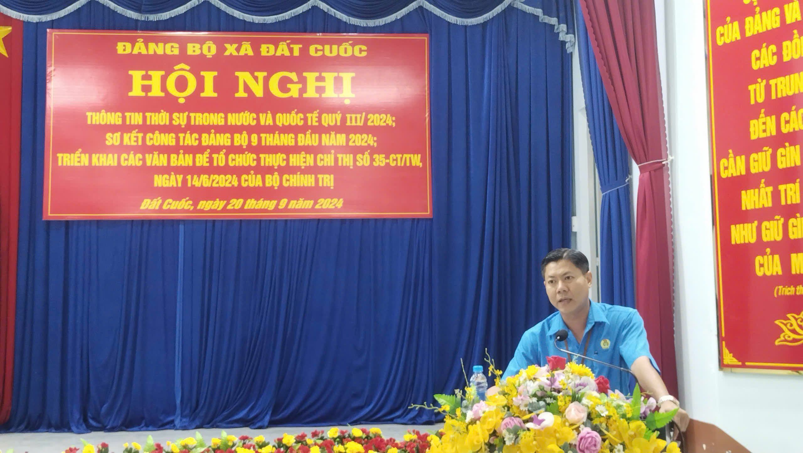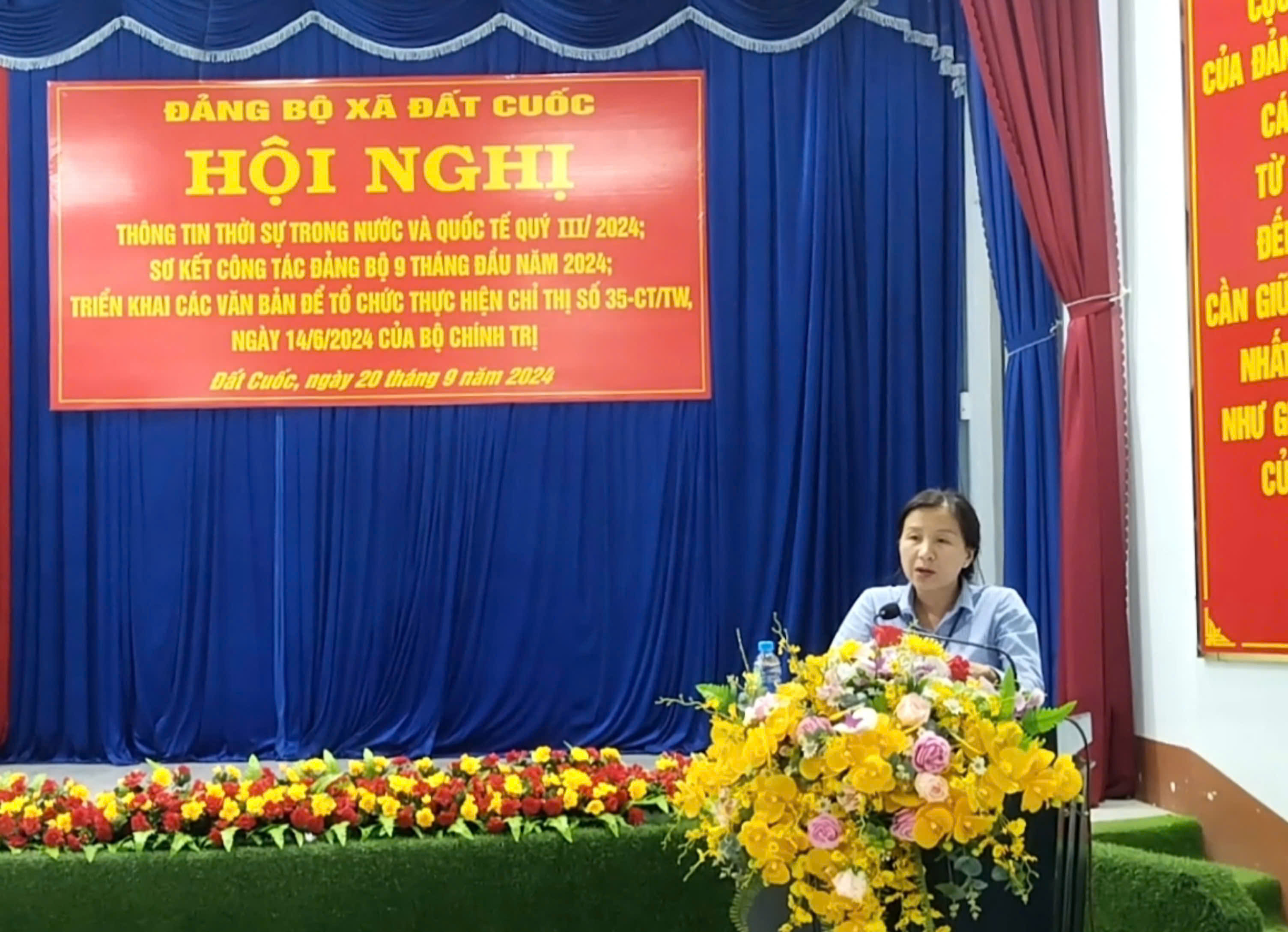 ĐẢNG ỦY XÃ ĐẤT CUỐC TỔ CHỨC HỘI NGHỊ THÔNG TIN THỜI SỰ QUÝ III NĂM 2024, TRIỂN KHAI CÁC VĂN BẢN ĐỂ TỔ CHỨC THỰC HIỆN CHỈ THỊ SỐ 35-CT/TW NGÀY 14/6/2024 CỦA BỘ CHÌNH TRỊ