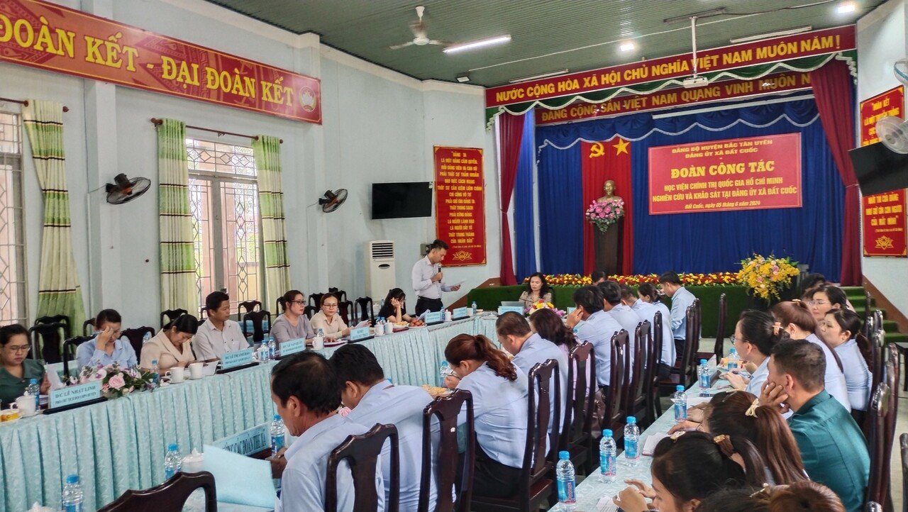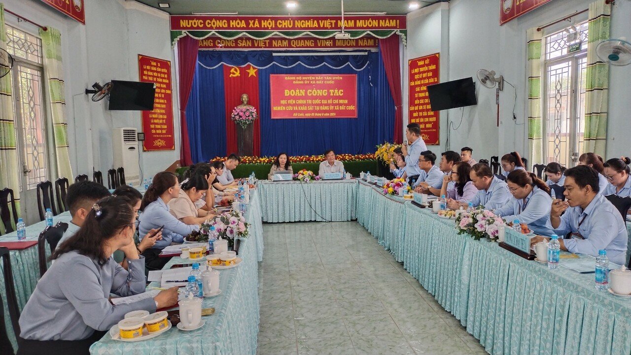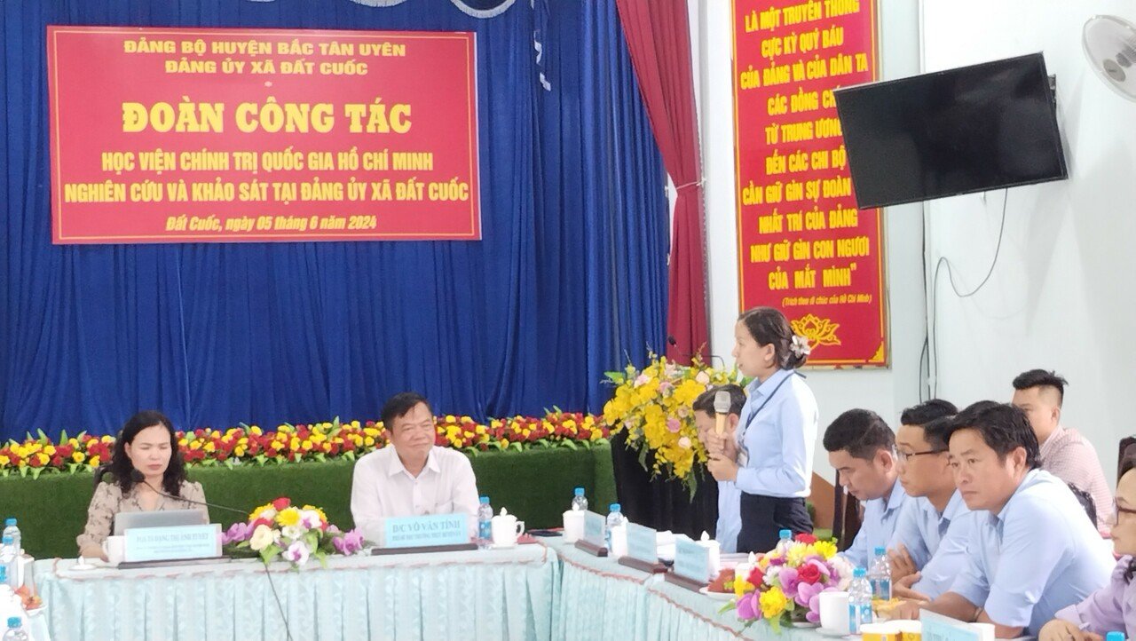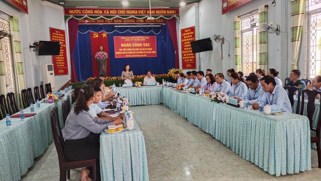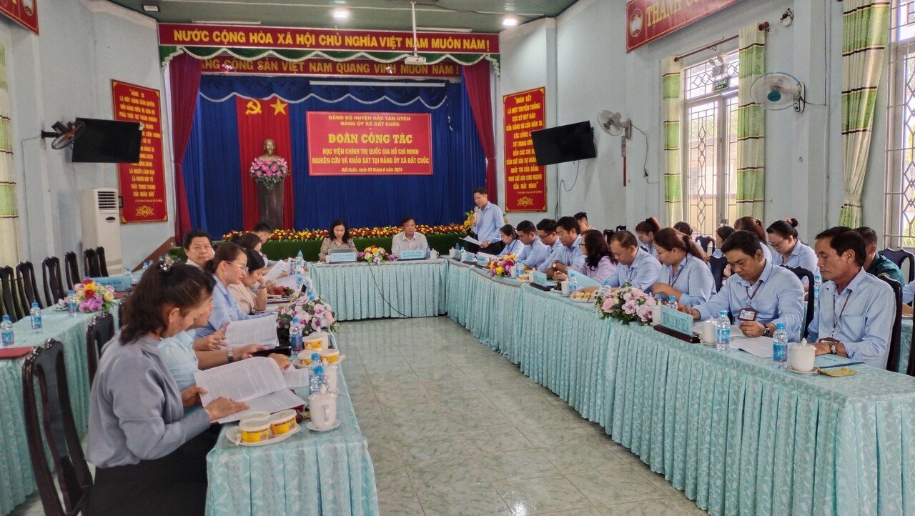 Tại buổi làm việc, Đoàn công tác đã nghe BTV Đảng ủy xã Đất Cuốc báo cáo về tình hình công tác cán bộ nữ tham gia cấp ủy Đảng của xã trong nhiệm kỳ qua; công tác quy hoạch cán bộ nữ tham gia cấp ủy nhiệm kỳ tới cấp ủy đảng, sau đó các thành viên của đoàn là các PGS.TS, giảng viên thuộc các Viện của Học viện và các đại biểu là lãnh đạo các Ban xây dựng Đảng huyện, lãnh đạo xã Đất Cuốc cùng thảo luận về kết quả đạt được, trao đổi một số nội dung liên quan đến công tác đào tạo, bồi dưỡng, quy hoạch, bổ nhiệm cán bộ nữ tham gia cấp ủy; tìm hiểu thực tế những thuận lợi, khó khăn, vướng mắc trong quá trình thực hiện, đồng thời đề xuất những giải pháp trước mắt và lâu dài để tăng cường cán bộ nữ tham gia cấp ủy thời gian tới, đáp ứng yêu cầu nhiệm vụ trong tình hình mới, để từ đó giúp đoàn từng bước hoàn thiện cái nhìn tổng thể về thực trạng công tác cán bộ nữ hiện nay làm cơ sở tham mưu xây dựng các Nghị quyết chuyên đề chuẩn bị cho văn kiện hướng đến Đại hội Đảng toàn quốc lần thứ XIV của Đảng.