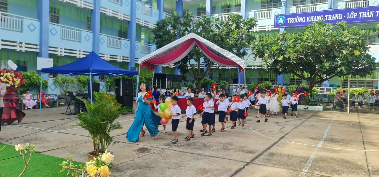 Trong buổi lễ, sau phần văn nghệ chào mừng của giáo viên và các em học sinh, đại biểu và quý thầy cô giáo cùng chào đón 120 em học sinh bước vào lớp 1 được chia thành 4 lớp