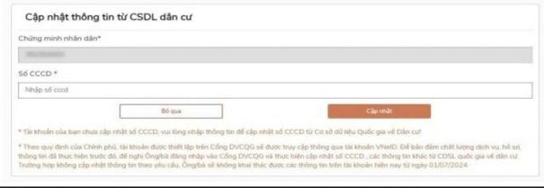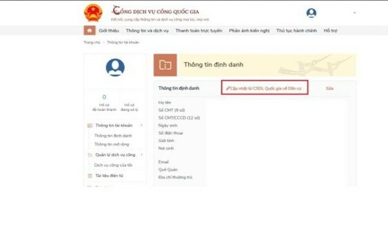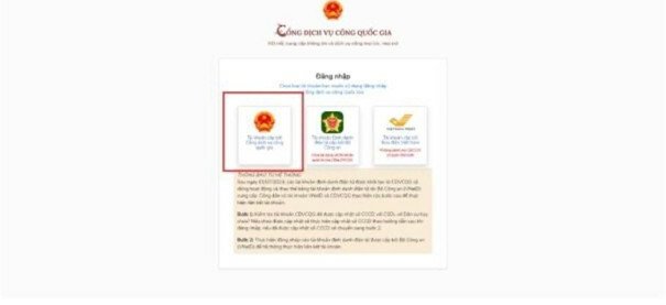 Bước 1: Kiểm tra tài khoản Cổng Dịch vụ công quốc gia đã được cập nhật số căn cước công dân với Cơ sở dữ liệu Quốc gia về Dân cư hay chưa - Đăng nhập vào Cổng Dịch vụ công quốc gia (https://dichvucong.gov.vn) bằng tài khoản được cấp bởi Cổng Dịch vụ công quốc gia.
