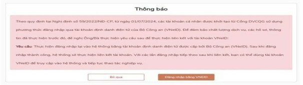 Ngày 05/9/2022, Chính phủ đã ban hành Nghị định số 59/2022/NĐ-CP Quy định về định danh và xác thực điện tử. Theo đó, khoản 12 Điều 35 quy định: “Bộ Công an phối hợp với các bộ, cơ quan ngang bộ, cơ quan thuộc Chính phủ, Ủy ban nhân dân các tỉnh, thành phố trực thuộc Trung ương thực hiện xác thực, đồng bộ dữ liệu các tài khoản đã được tạo lập, sử dụng bởi Cổng Dịch vụ công quốc gia, Hệ thống thông tin giải quyết thủ tục hành chính cấp bộ, cấp tỉnh với tài khoản do hệ thống định danh và xác thực điện tử tạo lập” và khoản 2 Điều 40 có nội dung: “Tài khoản do Cổng Dịch vụ công quốc gia, Hệ thống thông tin giải quyết thủ tục hành chính cấp bộ, cấp tỉnh được sử dụng để thực hiện thủ tục hành chính, dịch vụ hành chính công trên môi trường điện tử đến ngày 01 tháng 7 năm 2024”. Đồng thời, Thủ tướng Chính phủ đã ban hành Chỉ thị số 27/CT-TTg ngày 27/10/2023 về tiếp tục đẩy mạnh giải pháp cải cách và nâng cao hiệu quả giải quyết thủ tục hành chính, cung cấp dịch vụ công phục vụ người dân và doanh nghiệp. Theo đó, tại Chỉ thị 27/CT-TTg năm 2023 có nội dung: “Bộ Công an chủ trì, phối hợp với Văn phòng Chính phủ, bộ, ngành, địa phương thường xuyên cập nhật, hoàn thiện kịp thời, phù hợp các giải pháp kỹ thuật, hạ tầng và hướng dẫn thực hiện kết nối, tích hợp Hệ thống định danh và xác thực điện tử do Bộ Công an quản lý (VNeID), Cơ sở dữ liệu quốc gia về dân cư với Cổng Dịch vụ công quốc gia, Hệ thống thông tin giải quyết thủ tục hành chính cấp bộ, cấp tỉnh để đưa vào sử dụng tài khoản định danh điện tử VNeID trong thực hiện thủ tục hành chính, dịch vụ hành chính công trên môi trường điện tử trước ngày 01 tháng 7 năm 2024, đồng thời phục vụ giải quyết thủ tục hành chính, cung cấp dịch vụ công bảo đảm cắt giảm các giấy tờ như: giấy chứng minh nhân dân hoặc căn cước công dân, quan hệ nhân thân, giấy tờ chứng minh cư trú,...”.