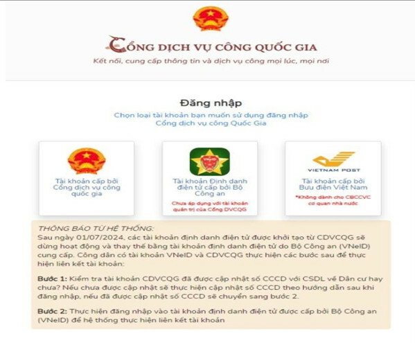 Cổng Dịch vụ công Quốc gia vừa có thông báo sau ngày 01/7/2024 các tài khoản định danh điện tử được khởi tạo từ Cổng Dịch vụ công Quốc gia sẽ dừng hoạt động và thay thế bằng tài khoản định danh điện tử do Bộ Công an (VNeID) cung cấp.
