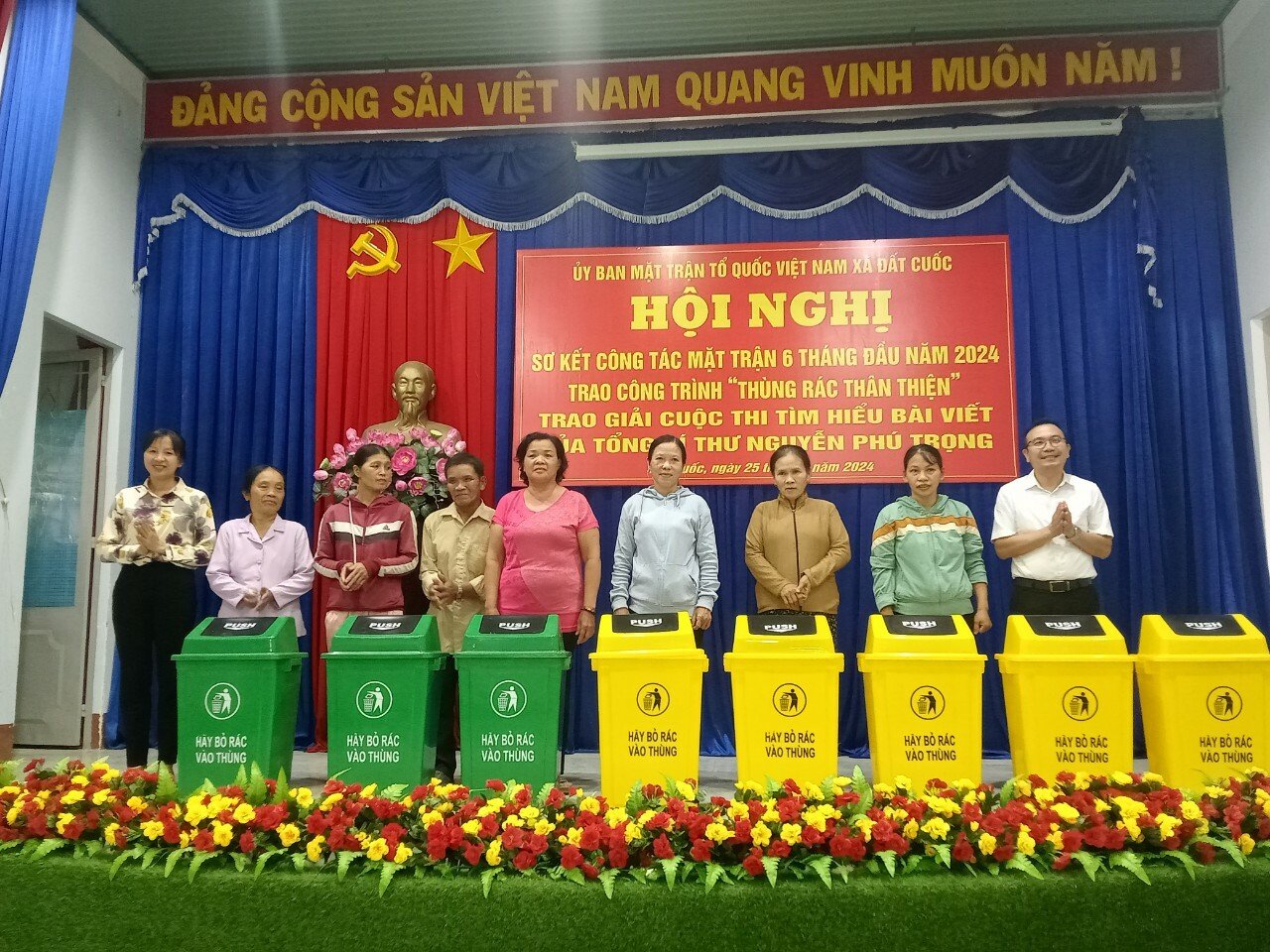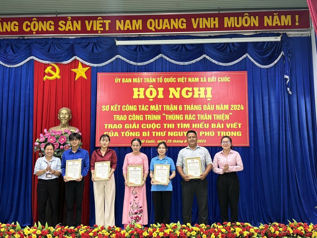 Nhằm đánh giá kết quả thực hiện nhiệm vụ công tác Mặt trận 6 tháng đầu năm, đề ra phương hướng, giải pháp trong thực hiện nhiệm vụ 6 tháng cuối năm 2024. Chiều ngày 25/6/2024, Ủy ban MTTQ Việt Nam xã Đất Cuốc tổ chức Hội Nghị Sơ kết công tác Mặt trận 6 tháng đầu năm, triển khai phương hướng nhiệm vụ 6 tháng cuối năm 2024, trao công trình “Thùng rác thân thiện”, trao giải Cuộc thi tìm hiểu Bài viết “Tự hào và tin tưởng dưới lá cờ vẻ vang của Đảng, quyết tâm xây dựng một nước Việt Nam ngày càng giàu mạnh, văn minh, văn hiến và anh hùng” của Tổng Bí thư Nguyễn Phú Trọng. Tham dự Hội nghị có Ông Nguyễn Ánh Linh - Ủy viên Thường trực Ủy ban MTTQ Việt Nam huyện Bắc Tân Uyên; Bà Nguyễn Thị Thu Hằng - Phó Bí Thư Đảng Ủy – CT HĐND – Trưởng khối vận; Bà Nguyễn Thị Cẩm Vân - ĐUV – PCT UBND xã cùng 80 ông, bà đại diện các ngành, đoàn thể xã, Thành viên Ủy ban MTTQ Việt Nam xã, Ban CTMT các ấp cùng tham dự