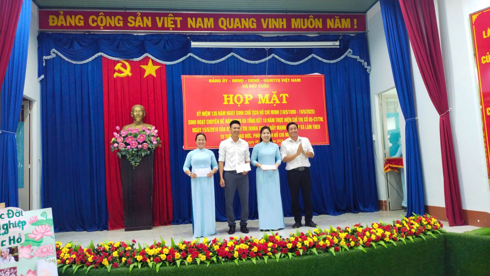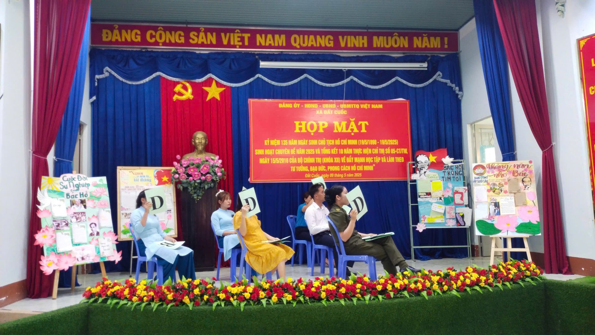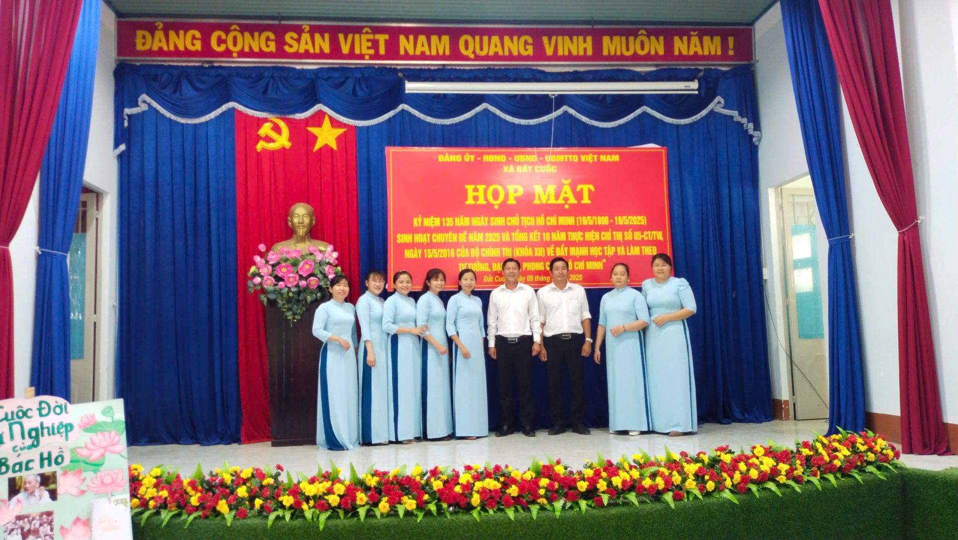 Sáng ngày 09/5/2025, Đảng ủy, HĐND, UBND, UBMTTQ Việt Nam xã Đất Cuốc tổ chức họp mặt kỷ niệm 135 năm ngày sinh của Chủ tịch Hồ Chí Minh (19/5/1890 -19/5/2024); Sinh hoạt chuyên đề làm theo Bác năm 2025; Tổng kết 10 năm thực hiện Chỉ thị số 05-CT/TW ngày 15/5/2015 của Bộ chính trị (Khóa XII) về đẩy mạnh học tập và làm theo tư tưởng, đạo đức, phong cách Hồ Chí Minh. Tham dự họp mặt có đồng chí Nguyễn Hùng Sơn – HUV – Bí thư Đảng ủy, đồng chí Nguyễn Thị Thu Hằng – PBT Đảng ủy - Chủ tịch HĐND xã cùng các đồng chí trong Ban chấp hành Đảng ủy xã, Bí thư các chi bộ, toàn thể Đảng viên các chi bộ trực thuộc cùng tham dự