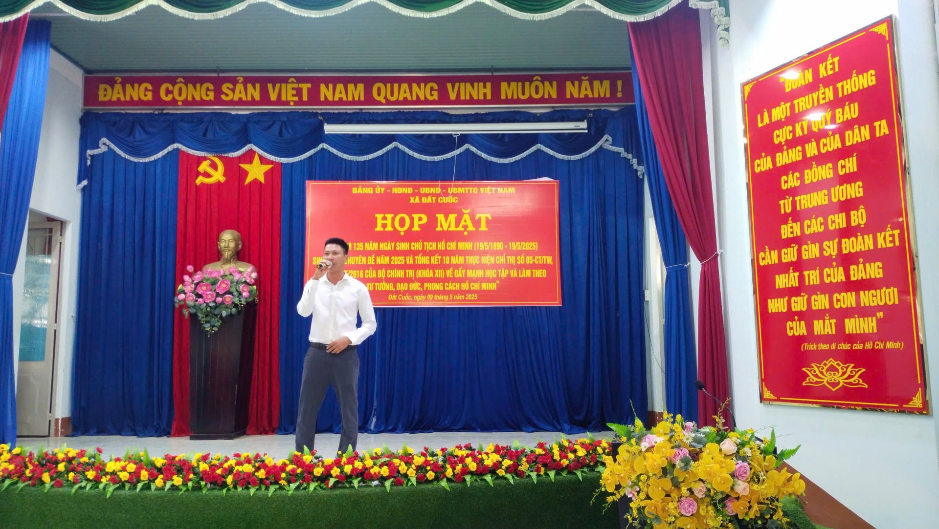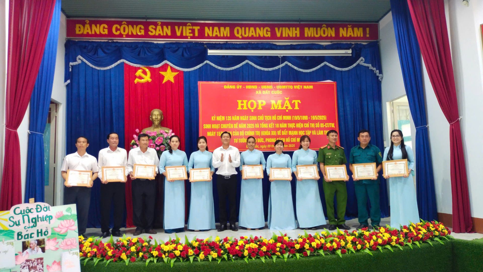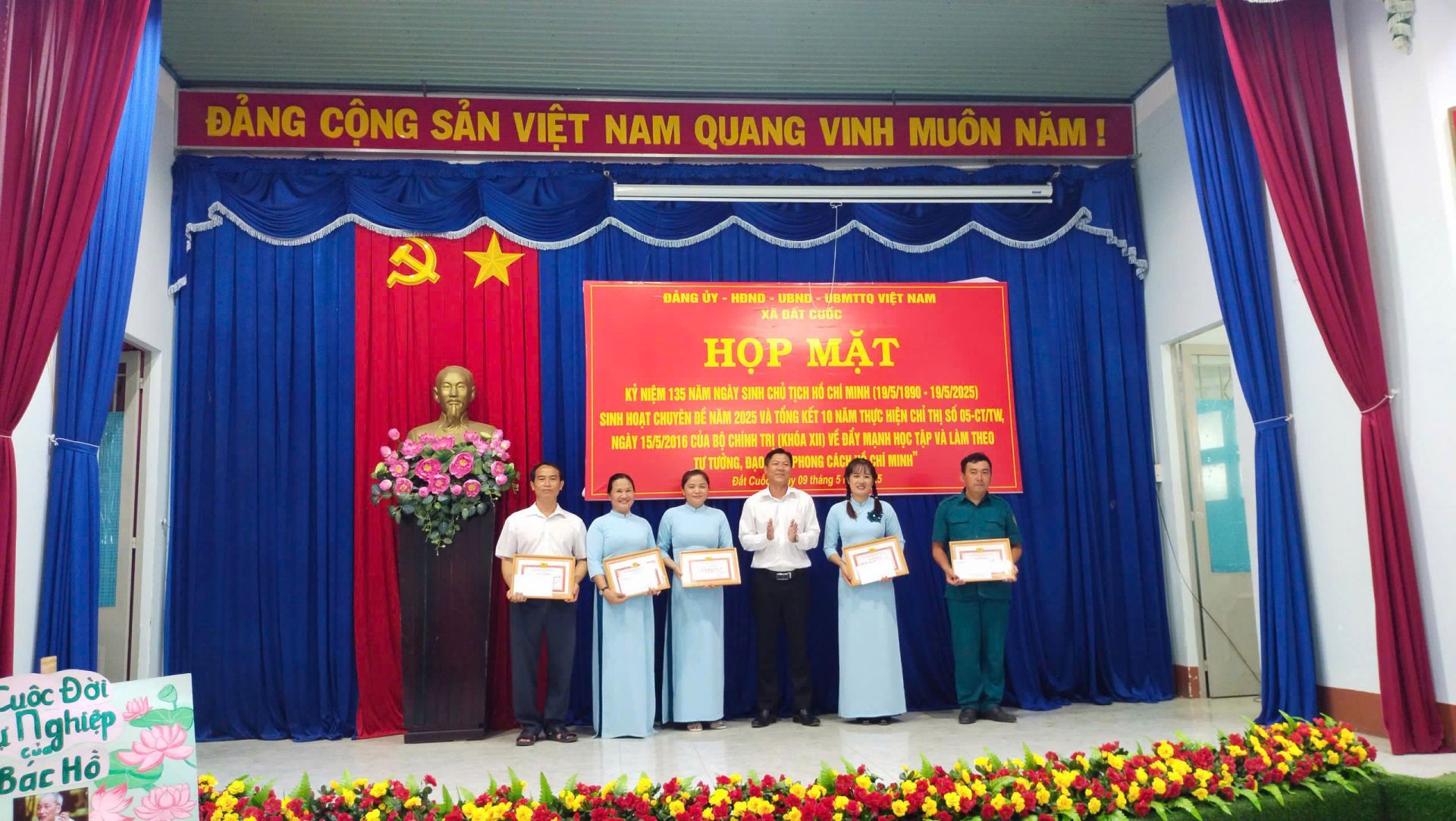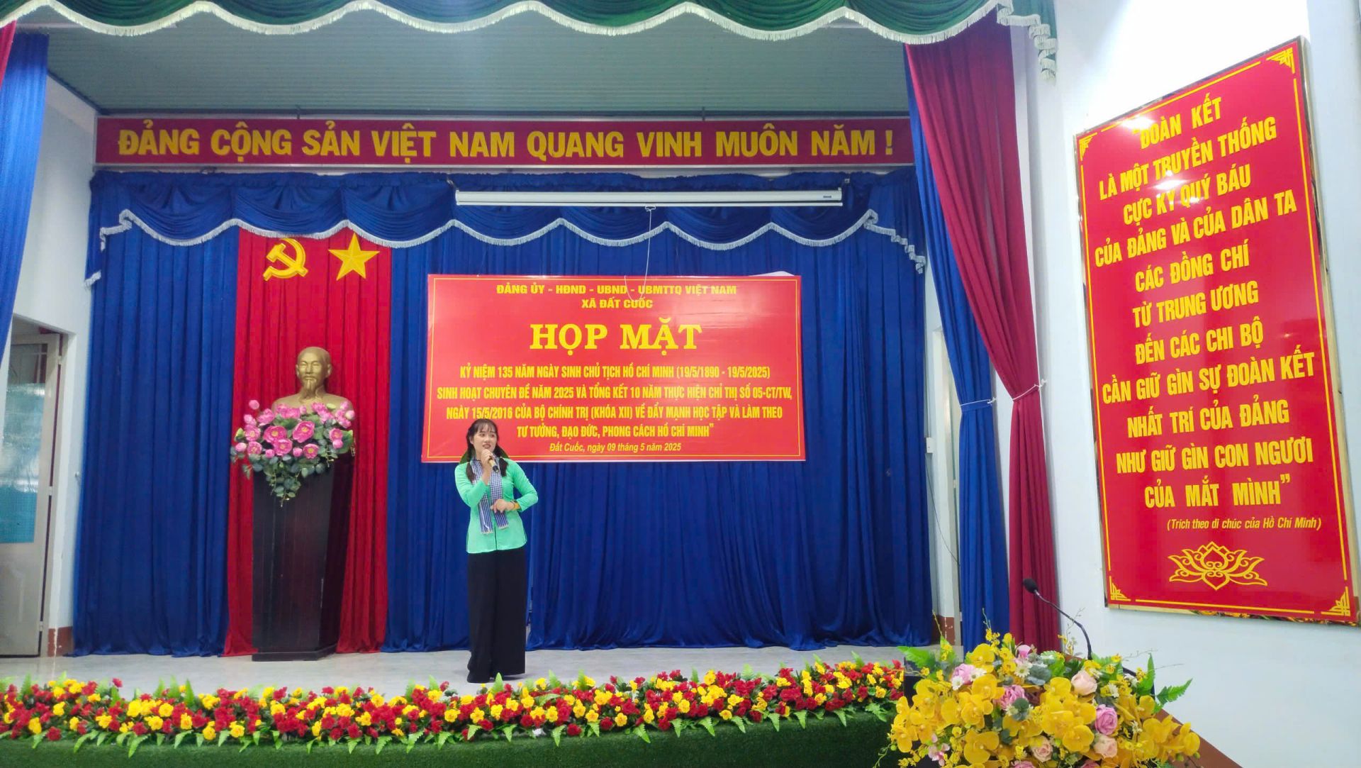 Sáng ngày 09/5/2025, Đảng ủy, HĐND, UBND, UBMTTQ Việt Nam xã Đất Cuốc tổ chức họp mặt kỷ niệm 135 năm ngày sinh của Chủ tịch Hồ Chí Minh (19/5/1890 -19/5/2024); Sinh hoạt chuyên đề làm theo Bác năm 2025; Tổng kết 10 năm thực hiện Chỉ thị số 05-CT/TW ngày 15/5/2015 của Bộ chính trị (Khóa XII) về đẩy mạnh học tập và làm theo tư tưởng, đạo đức, phong cách Hồ Chí Minh. Tham dự họp mặt có đồng chí Nguyễn Hùng Sơn – HUV – Bí thư Đảng ủy, đồng chí Nguyễn Thị Thu Hằng – PBT Đảng ủy - Chủ tịch HĐND xã cùng các đồng chí trong Ban chấp hành Đảng ủy xã, Bí thư các chi bộ, toàn thể Đảng viên các chi bộ trực thuộc cùng tham dự