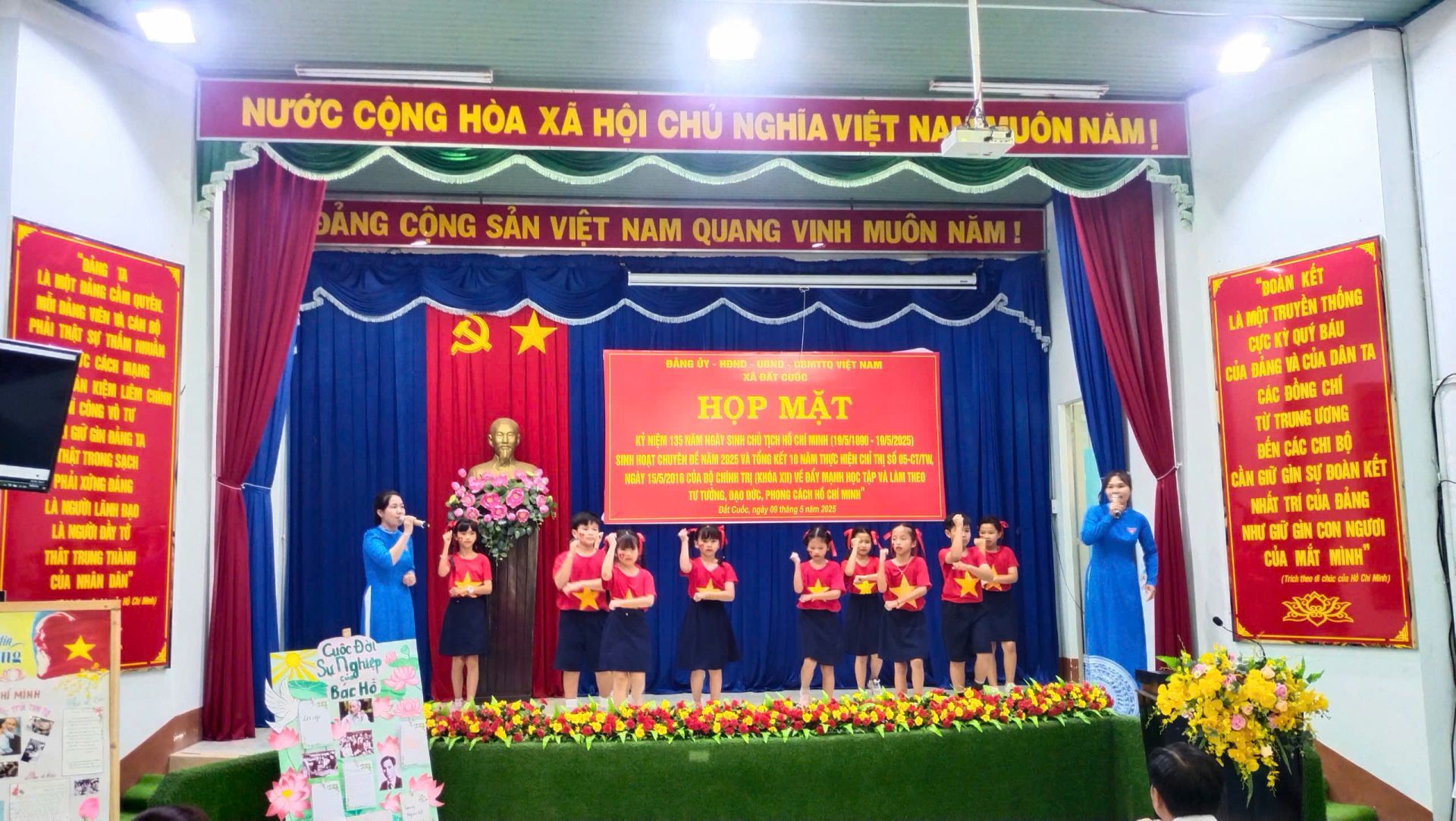 Tại chương trình chuỗi hoạt động kỷ niệm 135 năm Ngày sinh của Chủ tịch Hồ Chí Minh, các đại biểu đã cùng nhau xem phim tư liệu về tiểu sử Hồ Chủ tịch, ôn lại cuộc đời và sự nghiệp của chủ tịch Hồ Chí Minh. Lồng ghép trong buổi họp mặt, Đảng ủy xã còn tổ chức chương trình sinh hoạt chuyên đề với các nội dung như thi Rung chuông vàng với các câu hỏi xoay quanh cuộc đời và sự nghiệp của Hồ Chí Minh và phần thi văn nghệ với 10 tiết mục tham gia dự thi đến từ 5 đội thuộc các chi bộ trên địa bàn. Kết thúc buổi họp mặt, BTC đã trao 18 giải cho các đội có thành xuất sắc nhất trong các phần thi