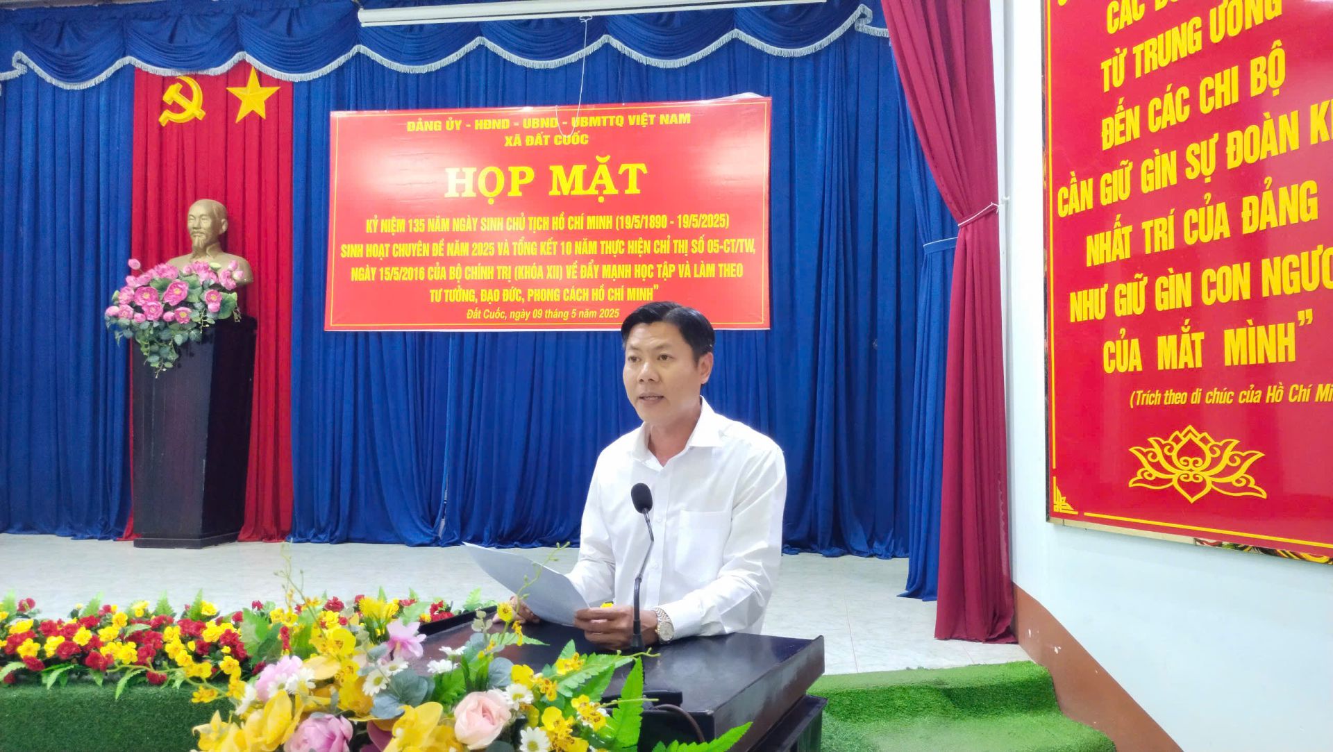 Sáng ngày 09/5/2025, Đảng ủy, HĐND, UBND, UBMTTQ Việt Nam xã Đất Cuốc tổ chức họp mặt kỷ niệm 135 năm ngày sinh của Chủ tịch Hồ Chí Minh (19/5/1890 -19/5/2024); Sinh hoạt chuyên đề làm theo Bác năm 2025; Tổng kết 10 năm thực hiện Chỉ thị số 05-CT/TW ngày 15/5/2015 của Bộ chính trị (Khóa XII) về đẩy mạnh học tập và làm theo tư tưởng, đạo đức, phong cách Hồ Chí Minh. Tham dự họp mặt có đồng chí Nguyễn Hùng Sơn – HUV – Bí thư Đảng ủy, đồng chí Nguyễn Thị Thu Hằng – PBT Đảng ủy - Chủ tịch HĐND xã cùng các đồng chí trong Ban chấp hành Đảng ủy xã, Bí thư các chi bộ, toàn thể Đảng viên các chi bộ trực thuộc cùng tham dự