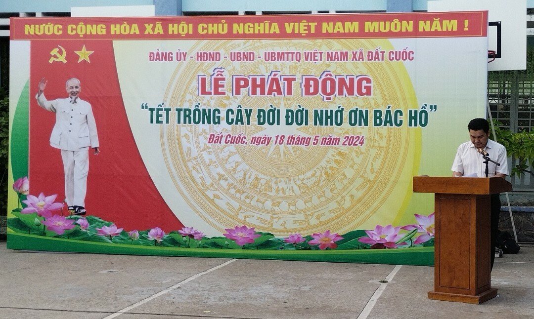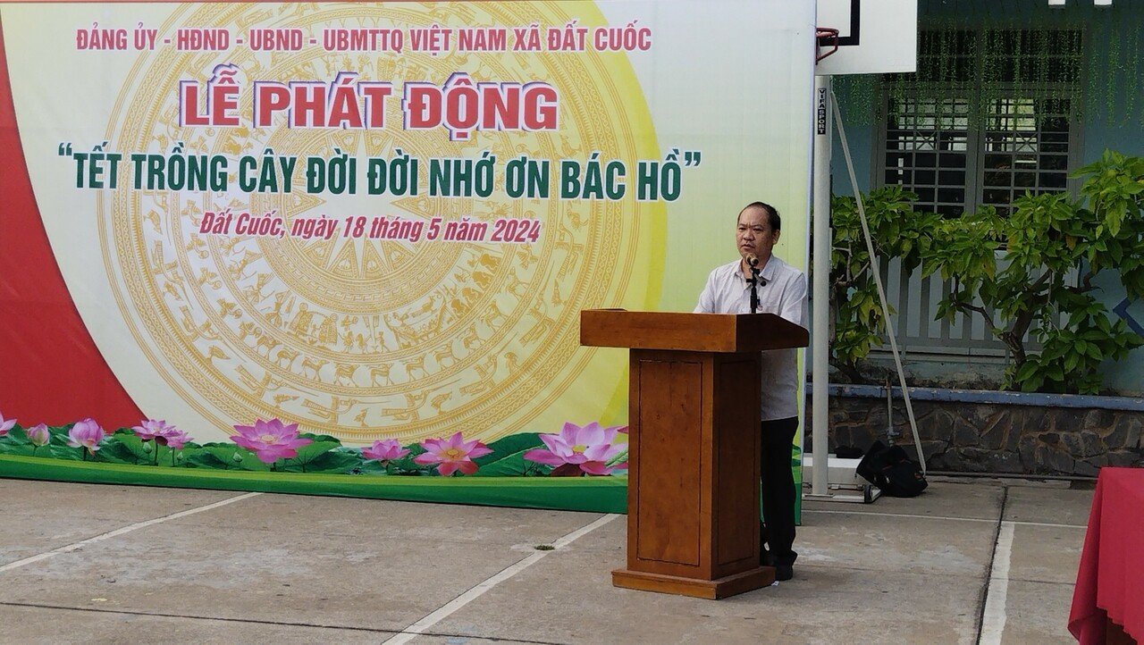 Phát biểu phát động Tết trồng cây, đồng chí Nguyễn Ngọc Tâm – PBT Đảng ủy - Chủ tịch UBND xã nhấn mạnh: Thực hiện lời dạy của Chủ tịch Hồ Chí Minh “Vì lợi ích mười năm thì phải trồng cây, vì lợi ích trăm năm thì phải trồng người”. Trong những năm qua, xã Đất Cuốc luôn xác định việc trồng cây xanh là việc làm quan trọng, gắn liền với quá trình phát triển toàn diện của xã, không chỉ cho hôm nay mà cho cả các thế hệ mai sau. Phong trào “Tết trồng cây” trong những năm qua đã mang lại nhiều kết quả, làm đẹp cảnh quan môi trường, nhất là trong tình hình biến đổi khí hậu toàn cầu đe dọa cuộc sống của con người như hiện nay, việc giữ gìn mảng xanh của trái đất ngày càng có ý nghĩa quan trong. Phong trào tết trồng cây, xã hội hóa cây xanh đã được nhân dân hưởng ứng tích cực; địa phương đã trồng nhiều cây xanh, cây ăn quả trong khuông viên trụ sở cơ quan, trường học, các tuyến đường giao thông nông thôn góp phần tạo được diện mạo nông thôn thanh bình, đổi mới từng giờ từng ngày trên bước đường xây dựng nông thôn mới.