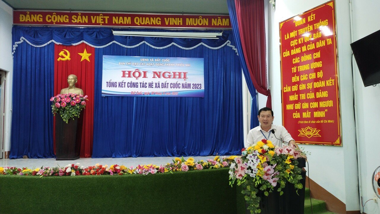 Chiều ngày 30/8/2023, Ban Chỉ đạo các hoạt động Thanh thiếu nhi xã Đất Cuốc tổ chức tổng kết hoạt động hè, trao giải Hội thi Lật trang sử vàng năm 2023 tại hội trường UBND xã. Tham dự Hội nghị có đồng chí Đoàn Văn Tạo, UVTV Huyện đoàn Bắc Tân Uyên; đồng chí Phạm Ngọc Uy, HUV, Bí thư Đảng ủy, Chủ tịch UBND xã, Trưởng Ban chỉ đạo các hoạt động TTN xã; đại diện các ngành, đoàn thể, thành viên Ban chỉ đạo và hơn 50 đoàn viên thanh niên, học sinh cùng tham dự.