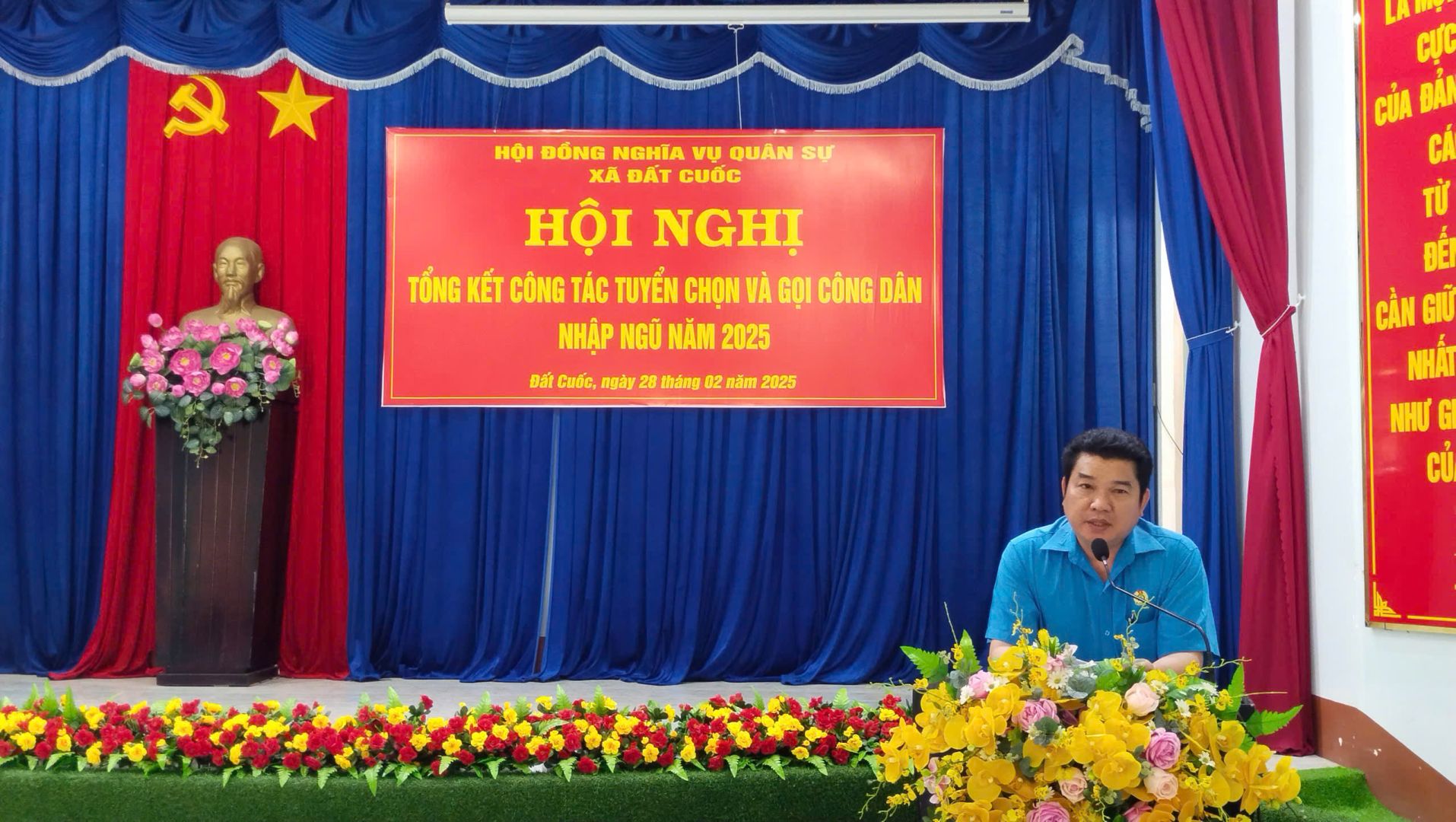 Chiều ngày 28/02/2025, UBND xã Đất Cuốc tổ chức Hội nghị tổng kết công tác tuyển chọn, gọi công dân nhập ngũ năm 2025, triển khai kế hoạch công tác tuyển quân năm 2026. Dự hội nghị có đồng chí Nguyễn Ngọc Tâm – PBT Đảng ủy – CT UBND xã – Chủ tịch HĐNVQS xã, cùng các đồng chí thường trực HĐND, UBMTTQ xã; các đồng chí thành viên HĐNVQS xã, trưởng Ban điều hành các ấp và gia đình thanh niên trúng tuyển cùng tham dự.