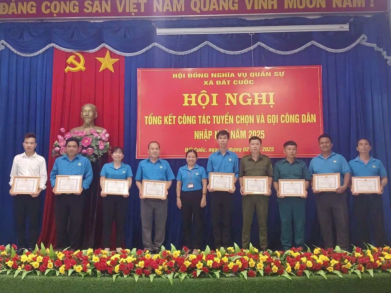 Năm 2025, Hội đồng NVQS xã Đất Cuốc đã tập trung lãnh đạo, chỉ đạo quyết liệt, đề ra nhiều giải pháp tổ chức thực hiện hoàn thành toàn diện công tác tuyển quân, bảo đảm chặt chẽ, đúng quy định, phù hợp với tình hình thực tế của địa phương. Chất lượng công tác xét duyệt chính trị cấp xã tiến hành đúng Luật, đảm bảo trình tự, chặt chẽ, công bằng, dân chủ. Kết quả sau khi xét duyệt cấp huyện, tổng số công dân trong diện sẵn sàng nhập ngũ là 75, đủ điều kiện gọi khám là 17 công dân, kết quả có 6 công dân trúng tuyển. Công tác hậu phương quân đội được địa phương thực hiện tốt, xã đã thành lập đoàn đến từng nhà gặp mặt thăm hỏi, động viên tinh thần, tặng quà các thanh niên lên đường nhập ngũ.